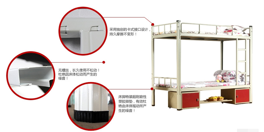 聚大家具公司双层铁床采用优质钢板,杉木铺板,美观,耐用,钢架表面经过除锈,打磨喷涂而成的,适用于工厂,学校,以及各种场所使用。宿舍学生双层床尺寸:长1.98米,宽0.9米,高1.75米。