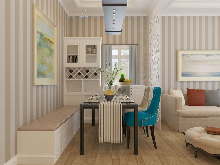 【商品描述】:餐厅坐椅做成卡座形式,个性化,还能收纳。餐边柜有操作台、酒格、开放区和闭合区,功能齐全, 构成餐厅的必备品,很适合小户型的设计。