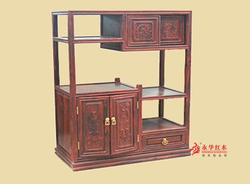 【商品详细描述】:此茶棚通体为大红酸枝。分为三层,格层间错落有致,简洁疏朗。左下角为柜,对开双门,柜门浮雕花纹。右下角设有一具抽斗,配有心形拉手。整体造型简约,比例协调,溢着悠然灵动之韵。