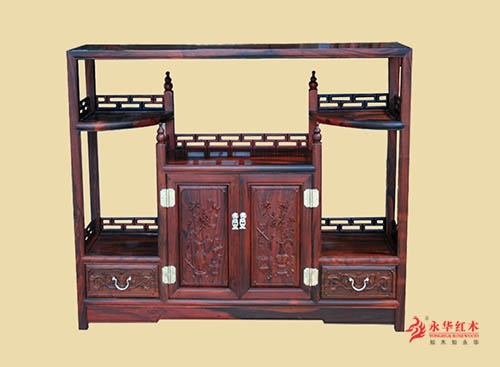 【商品详细描述】:此茶柜通体为大红酸枝,设有五个亮格,格面错落有致,格拦板镂雕方形纹,且在方柱上圆雕葫芦。“葫芦”音同“福禄”,寓意富贵、长寿、吉祥。线条流畅明快,构造隽秀,观感舒适。中下部设有闭合柜,对开两扇门,浮雕花纹。两侧设抽屉两具,配有铜拉手,浮雕花草纹。牙板光素,直腿方足,工艺精湛。
