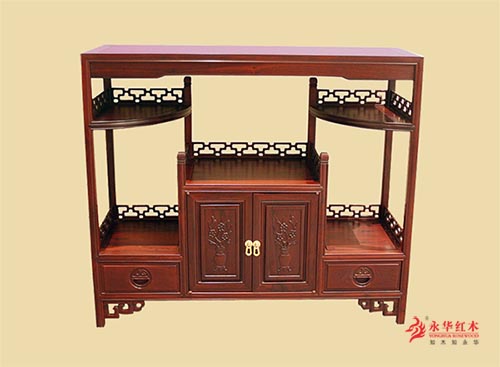 【商品详细描述】:此茶柜通体为大红酸枝。设有错落有致的柜格,线条流畅柔和,格拦板镂雕凸字纹。中下部对开两扇门,门面浮雕花纹,两侧各一抽斗,下镂雕拐子纹牙头。整体造型,简约疏朗,空灵隽秀,于方寸间透着幽幽雅韵。
