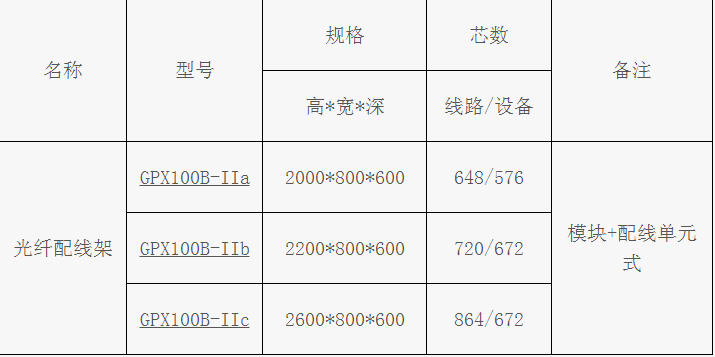 1.机柜采用19”寸标准安装,分光纤配线柜(GPX72-2200) /光纤配线柜(GPX72-2000)两种。