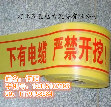 河北五星电力设备有限公司警示带又称标记带,广泛地应用于各种直埋式燃气管道、输油管道、城市给排水等气、液管道输送系统、电力电缆、通讯光缆等关于国计民生的第五类运输体系及信息传输系统的警示防护,特别对各种情况复杂的城市管网施工现场、道路施工现场、交通事故现场保护,建筑建设施工现场、田野中的直埋管线有着明显的防护警示作用,它施工方便,施工与埋管同时进行,埋覆于地下与管线中间,铺设在管道上面30-50CM处,起到警示标志作用,以免今后开挖施工时管线受无谓损伤,而造成重大事故,避免因意外损坏造成巨大的财产和经济损失,是各种直埋式管道、线缆安全防护的经济有效、简单易行的用品。
