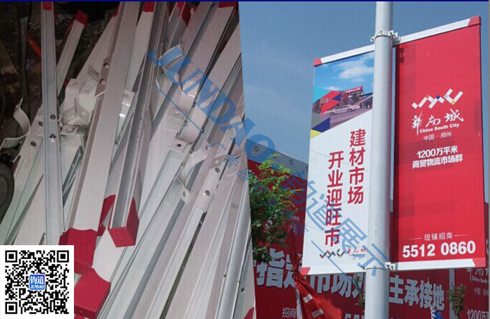 道旗的旗杆(支撑杆):目前的道旗安装旗杆支撑有普通铁质方管和圆管,也有不锈钢管和镀锌管,上下横梁多数采用铝合金旗杆,使用时限长,可多次拆卸,易于加工。