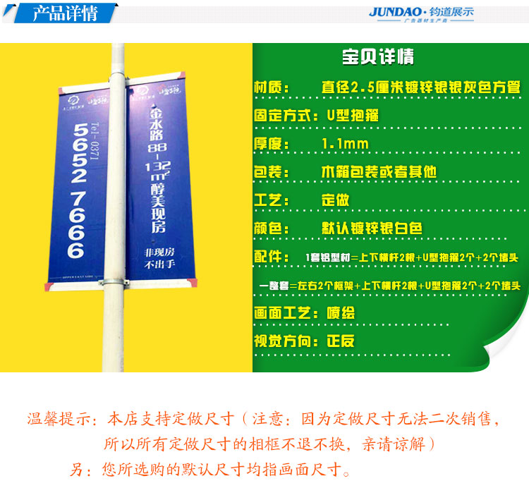 抱箍大小是根据灯杆直径配套使用,做好的框架直接卡到道旗的卡槽里就可以了,高度可以抱箍尺寸可根据实地灯杆大小定做,客户息行量好类杆周长即可,其它工作交给我们。