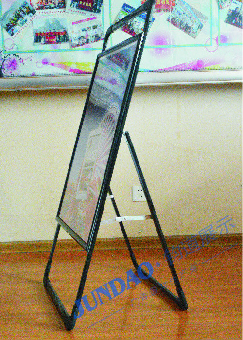 海报架的边框用铝合金材质制成,因为铝合金的比较牢固、便携。背板多用PVC材料,也有用KT板或者其他材料做的。