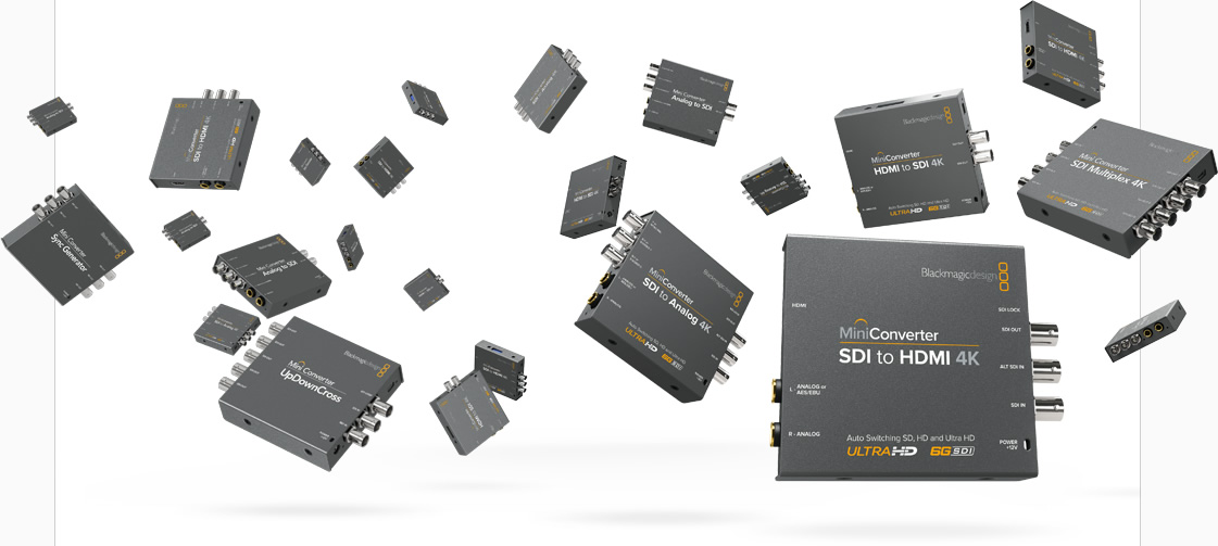 新款Blackmagic Mini Converter是世界先进转换器,它们配备最新6G-SDI技术,可自动检测输入视频格式,并可以立即转换到包括SD、HD和Ultra HD在内的几乎所有视频格式!连接Mini Converter后,它会自动为您将信号转换为与您的设备匹配的格式!