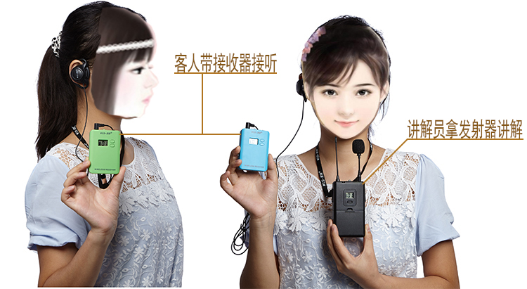 无线讲解器主要分为2个主要的部分:一部分叫发射器,另一部分叫接收器。发射器是需要讲话的人使用的,配件是麦。需要讲话的人持发射器对着麦用正常的音量讲话即可(不需要像扩音器那样大声喊)。需要听讲的人佩戴接收器,所有佩戴接收器的人在百米之外都可以非常清楚的听到持发射器讲话者的声音,就好像ta在您耳边讲话一样!