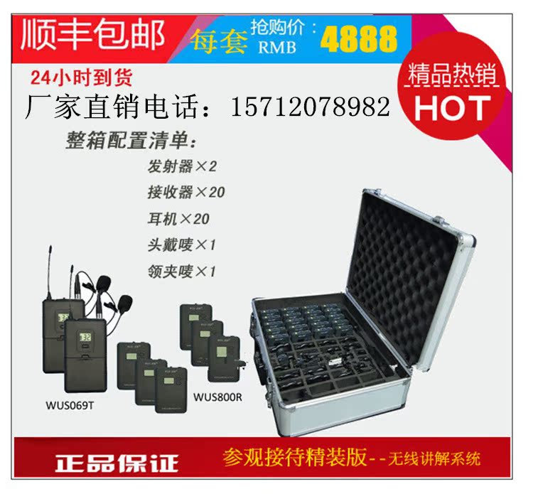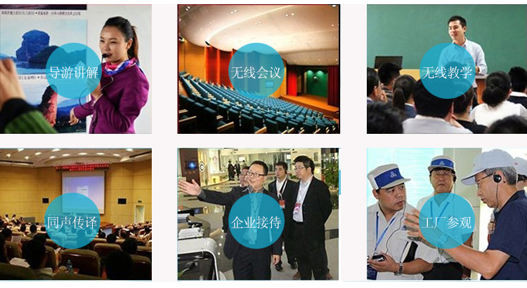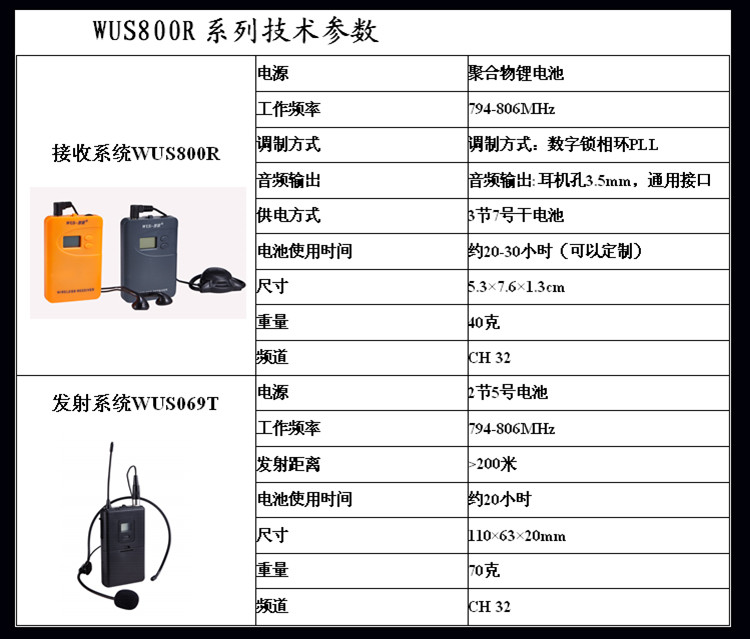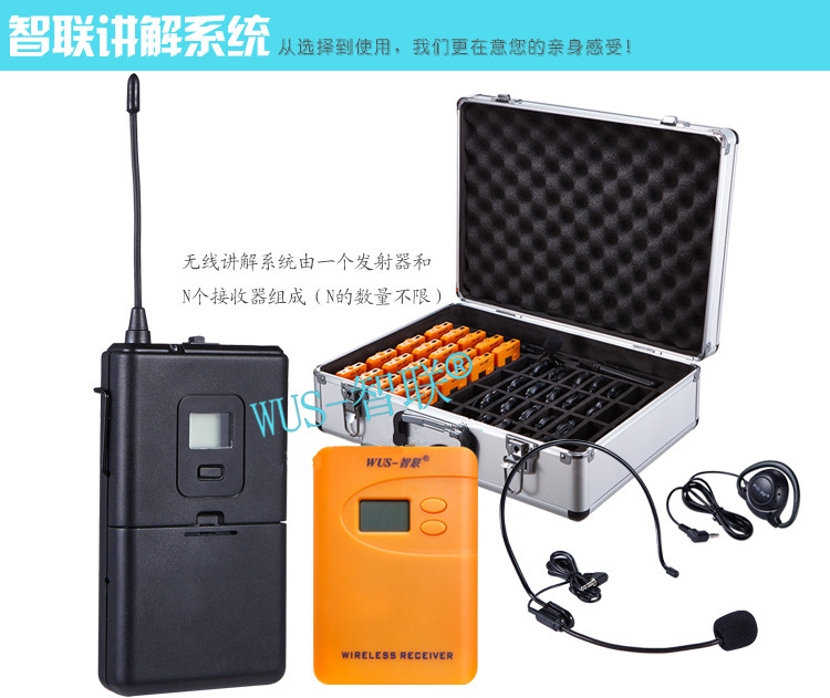 本系统是由一个腰挂式发射器和多个接收器及其附件构成,性能稳定可靠.WUS069T是腰包式便携发射器,同一场合能提供32组不同信道,可配合耳挂咪,领夹咪,头戴咪使用,或连接其它音源.WUS800R是体积小巧便携式的接收器,参观者无需任操作便可听到讲解员的声音,使用简便舒适。