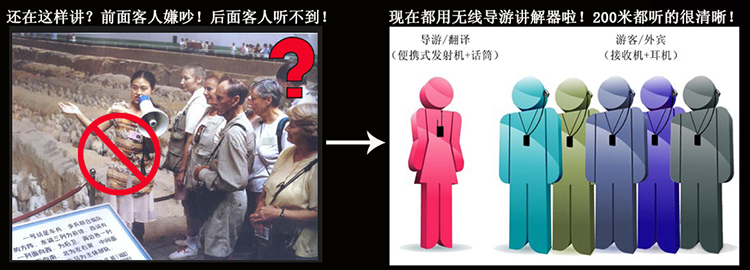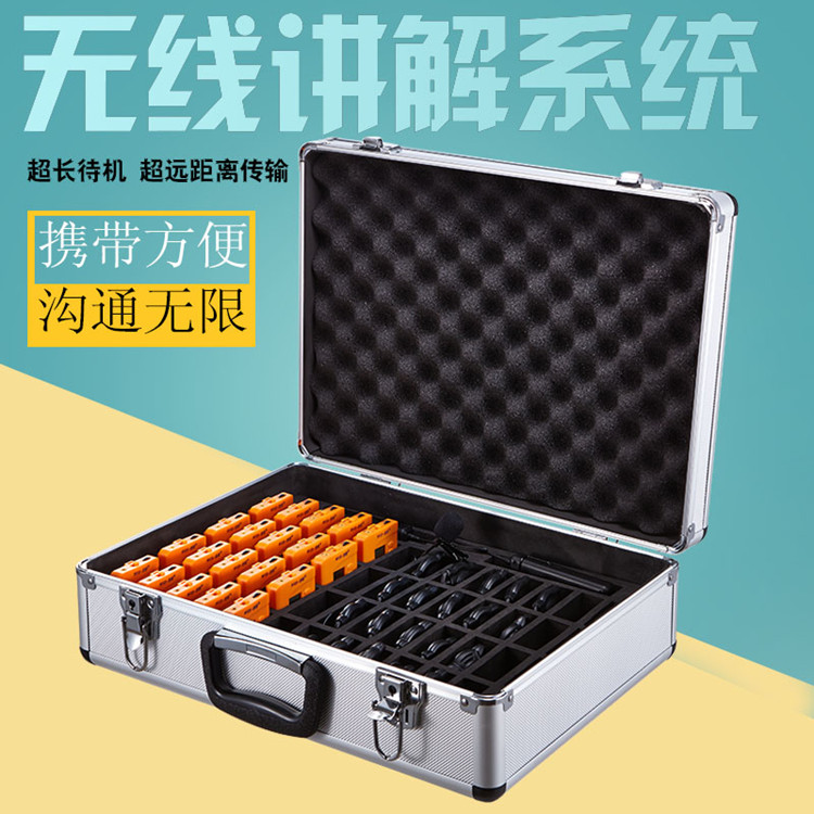 整套无线导游系统由一个数字无线发射器(或多个发射器)及多个数字接收器组成,讲解发射器由现场讲解员携带,来访客人每人使用一只接收器及与之配套的耳机来收听。接收器的数量可以达到上百个,参考使用半径约120米。同一场合可以容纳0-95组接待团体同时使用,组与组之间不会有任何干扰。