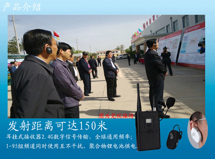 无线讲解器主要分为2个主要的部分:一部分叫发射器,另一部分叫接收器。发射器是需要讲话的人使用的,配件是麦。需要讲话的人持发射器对着麦用正常的音量讲话即可(不需要像扩音器那样大声喊)。需要听讲的人佩戴接收器,所有佩戴接收器的人在百米之外都可以非常清楚的听到持发射器讲话者的声音,就好像ta在您耳边讲话一样!