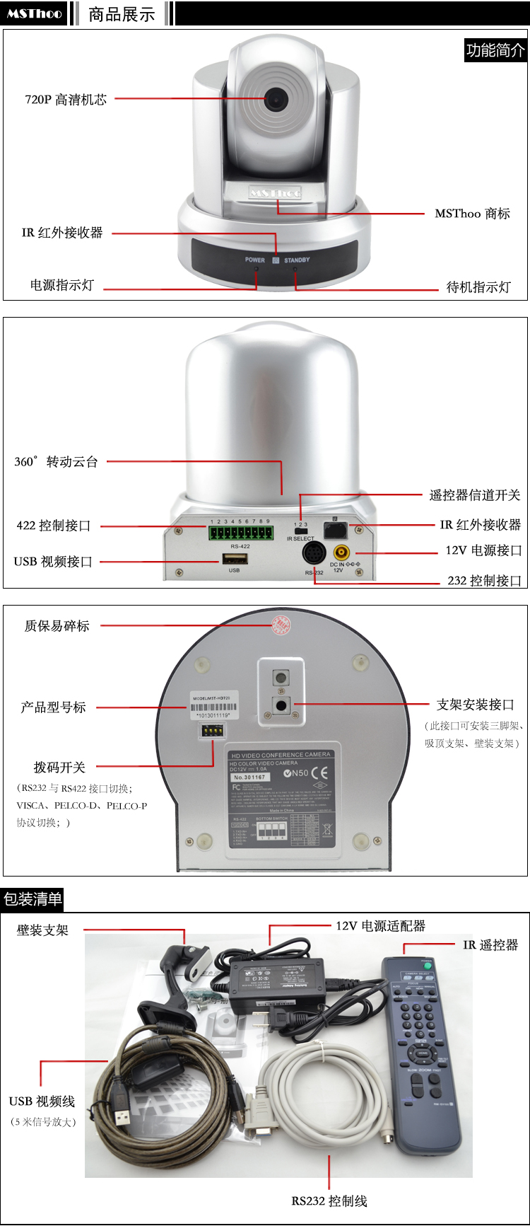 MST-HD720高清广角视频会议摄像头是视频会议系统业界专用摄像 头。外形美观、造型别致、结构紧凑;运行平稳、无噪声 、云台转速可调;定位精确、停止时无偏差抖动,可靠性高;可长期稳定运行,使用方便,无须维护。具有多点目标预置、记忆、区域扫描、辅助开关控制、红外遥控等功能。360°水平无限制扫描范围,兼容多种控制协议,采用标准USB/RS232控制方式。