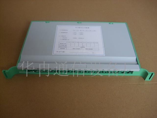 光分路器托盘,是光缆交接箱的配件,含有槽形结构的壳体、盖板,插接端头、加强边;在壳体的前端设有17个开孔为斜状的法兰盘固定槽--满足光缆线1进16出的要求,两个锁盖扣,在壳体的后端设有槽卡和凸台,右边设有护线弧,壳体的两边设有侧面凸台,在壳体两侧设有插接端头和加强边,在壳体背面设有加强筋;在盖板的前端设置有17个法兰盘固定孔及两个锁盖孔,后端设有插接槽,在盖板法兰盘固定孔的下方设有凹槽,在盖板的背面设有加强筋;本实用新型的积极效果是:具有走线多、线络清楚、分路明确、弯曲度合理的优点,能有效提高光缆交接箱的使用功能。