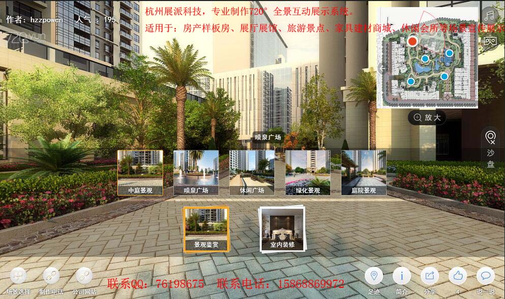 杭州展派科技推出的“720°全景展示系统”具有极高的性价格比,得到众多知名地产商,如绿城集团等的青睐。我司研发“720°全景展示系统”案例众多,制作经验丰富,产品展示效果好,价格实惠。同时我们的“720°全景展示系统”能够兼容过个平台,包括网页端、微信端,电脑、IPAD、手机等设备均可以查看,推送宣传。28478718341(不是联系方式)而且我们不仅可以制作实景拍摄的720°全景展示系统,也能制作三维虚拟建模的的720全景展示系统。并且我们还能封装成独立的720°全景APP系统。