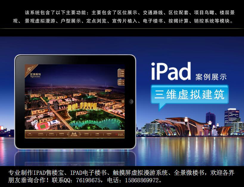 “IPAD 3D互动售楼宝”又名ipad售楼系统(IPAD售楼宝),承载载体为IPAD设备,主要应用于房地产售楼展厅一对一展示、移动式展示。“IPAD售楼宝” 是一套集合了“360°旋转功能”、“720°全景功能”、“动态特效”、“三维动画”多种功能于一体的IPAD三维展示方案。“IPAD售楼宝”主要应用于房地产虚拟展示,该系统综合展示了一个房地产项目各大主要模块内容,包括:电子楼书、区位配套、园林景观、户型鉴赏、宣传片、按揭计算器、等多种功能于一体的数字展示系统。