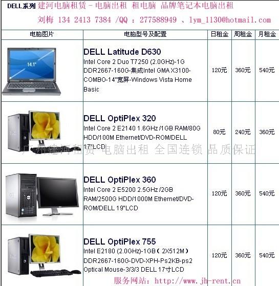 建河电脑租赁 全国最大的连锁电脑租赁商专业主营品牌台式电脑(DELL、苹果、联想等)、笔记本电脑(IBM、DELL、HP)、打印机、网络产品、办公设备、投影设备等租赁,面向 广州、北京、上海、青岛、深圳全国连锁大量供应IBM笔记本电脑 、DELL笔记本电脑、HP笔记本电脑)出租,也可承接上6000台全新双核笔记本电脑、台式机电脑出租,是广州唯一能够提供电脑的电脑租赁商家,租赁价格合理,可免押金,送货上门,免费调试、安装其维护电脑硬件、软件、网络调试等。租用量大更优惠,建河电脑租赁还拥有一支专业的电脑维护队伍(服务网站:http://www.jh-rent.cn),随时为您提供技术支持, 让您租得放心,用得舒心!建河电脑租赁诚心邀与您合作,共同发展,欢迎各界人士来电咨询/洽谈!