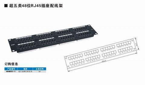据配线架都是安装在19in(19英寸)标准机柜上的,主要有AMP安普超五类24口配线架和AMP安普超五类48口配线架两种规格,主要用于端接水平布线的4对双绞线电缆,如果是数据链路,则用RJ45跳线连接到网络设备上,如果是语音链路,则用RJ45-110跳线跳接到110配线架(连接语音主干电缆)上。