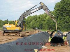 我公司生产的马蹄形波纹涵管是指涵洞用螺纹波纹管的截面形状成马蹄形的金属管。波纹涵管施工方法1、涵洞施工前,准备相关材料、人员及设备进场,并作好施工时期的安全防护工作,对路基边坡进行围网防护,防止石块等物体下滑伤人。2、基础处理,可回填沙砾或砌筑片石砼。对基底进行平整,换填30-50cm厚的沙砾材料,密实度达到90%以上,选择适当的流水纵坡3%左右。定出每道涵的中线和边线。3、波纹涵管施工时,采用分段施工的方法,预先在原拱涵基底用角钢并排两根,长度根据涵长确定。作涵管推进时的滑轨,波纹涵管管径根据工程需要可有不同的规格,整装管管径为0.5m--2.5m; 每节管长度3米左右。采用内(外)法兰螺栓连接。拼装管管径为3m--8m。每个圆周方向有4---15块板组成,板与板搭接高强螺栓紧固。4、如果涵长小于30米,波纹涵管两侧与原涵宽度大于80cm,可将整道波纹涵管在下游或上游向一端推进,就位以后,再进行一端挡墙的砌筑,四周的回填工作,可回填沙砾、碎石土,砌筑片石等,顶部采用浆砌片石或高压泵送膨胀水泥沙浆。5、如果涵长大于30米,波纹涵管两侧与原涵宽度小于80cm,可将3m-6m长涵管在下游或上游向一端推进,就位以后,可以将其固定,砌筑顶端的片石端墙,波纹涵管的另一端与涵洞间的间距用沙袋或浆砌片石挡住,宽度50cm,然后开始回填。两侧可用粗沙水密法密实或浇注混凝土震动棒捣实;顶部采用高压泵送膨胀水泥沙浆。该节管四周填筑完毕以后,将第二节管运至,进行两管的连接,波纹涵管的连接方式为内法兰螺栓连接,工人可在管内连接。连接完毕后,以上述相同的方法进行回填。依此顺序,完成整道波纹涵管的修建工作。