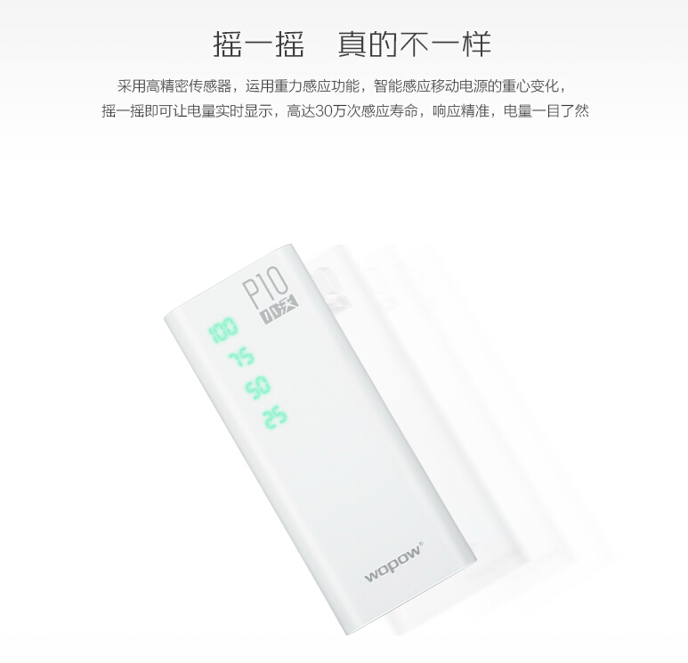 “小沃”的P10移动电源,这款移动电源最大的特点是独创摇一摇电量显示功能,在体感操作上更胜一筹,带给我们更好的使用体验。沃品P10内置10000mAh大容量电芯,售价仅99元。