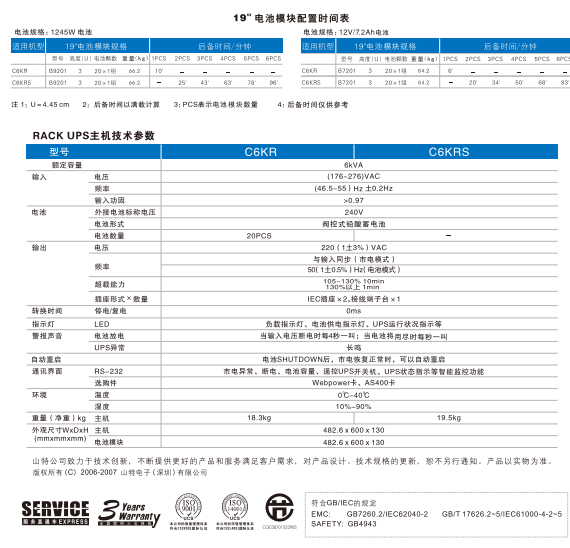 Rack UPS配置了主机相同尺寸的标准电池包(供客户选择)。除要求C2KR、C3KR、C6KR标机配置一组标准电池包外,还要求C1KRS、C6KRS长效机配置2组以上标准电池包,及C2KRS、C3KRS长效机配置3组以上标准电池包。标准电池包内电池均采用高品质的原厂松下蓄电池,以良好的电池质量,保证UPS使用安全性与可靠性。