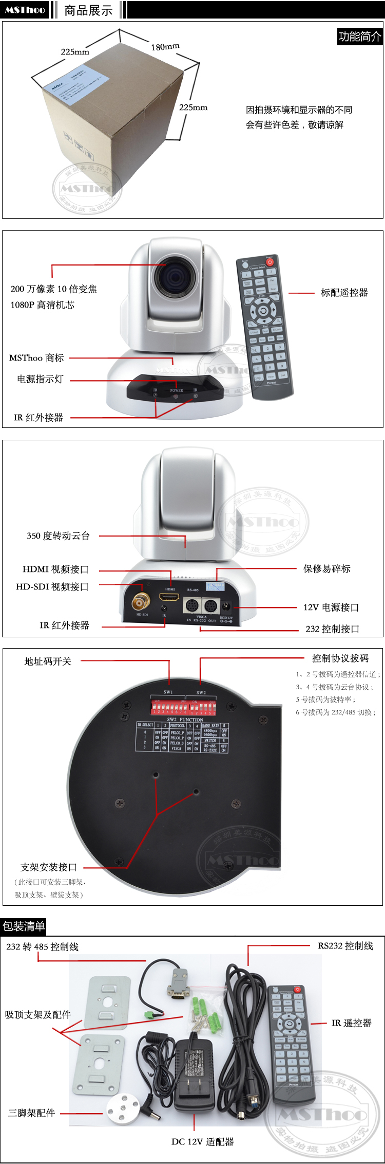 视频会议高速型摄像机MST-HD200产品是视频会议系统业界专用摄像机,采用日本原装全高清1080P机芯(原始图像,绝对没有压缩)。外形美观、造型别致、结构紧凑;运行平稳、无噪声;定位精确、停止时无偏差抖动,可靠性高;可长期稳定运行,使用方便,无须维护。具有多点目标预置、记忆、区域扫描、辅助开关控制、红外遥控等功能。350°水平无限制扫描范围,兼容多种控制协议,采用标准RS485/RS232控制方式。