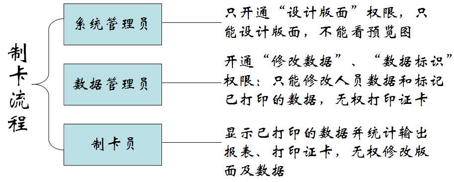 对于管理制证数据较为严格的企业单位来说,“权限分配”显得颇为重要。数据采集录入、证件版面制作、证件打印等工作如划分清楚就可以极大程度地保证证件的安全性,避免证件重复发放,引发不必要的麻烦。