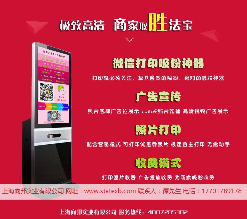 上海微信打印广告机|微信打印广告机厂家|微信照片打印机供应商|微信打印广告机租赁 上海向邦实业有限公司 联系人:谭先生 电话:17701789178 微信照片打印广告机是以微信公众平台为基础而开发出来的一款营销神器。现在的绝大部分商家都已经拥用企业微信公众平台,而如何吸引粉丝的关注成了关键问题。而吸粉正是我们生产的这款微信照片打印广告机的众多功能之一。消费者想要使用免费打印照片功能,必须得关注微信照片打印机屏幕上面商家提供的微信号才能实现;微信照片打印广告机打印出来的照片其中有一部分为广告区域,消费者打印照片的同时也打印了商家的广告(比如商家提供的公众号二维码),消费者打印的照片一般不会随意丢弃,所以商得也得到了持续宣传效果.