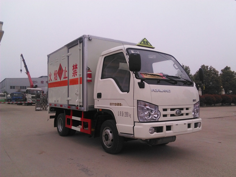 一、 易燃液体厢式运输车由福田载货汽车底盘(带前碟后鼓、ABS、电子限速)改装而成。厢体外为冷扎钢板材料制成,中间为钢体骨架,内壁采用铝合金板蒙面,外蒙三合板,内夹层为隔热阻燃材料填冲。厢体两侧上方及厢体后门都设有百叶窗通风口。