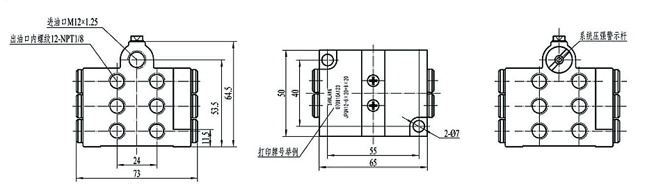 型号左侧□表示总有效出油口数量,中间口表示 无进油口侧出油口数虽;右侧口表示进油口侧口 油口数量。母分配器的排量为0.50ml/往复;