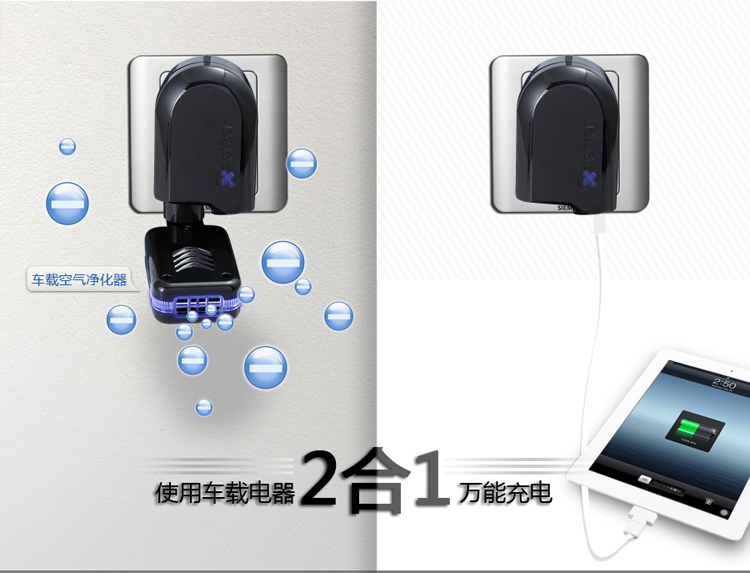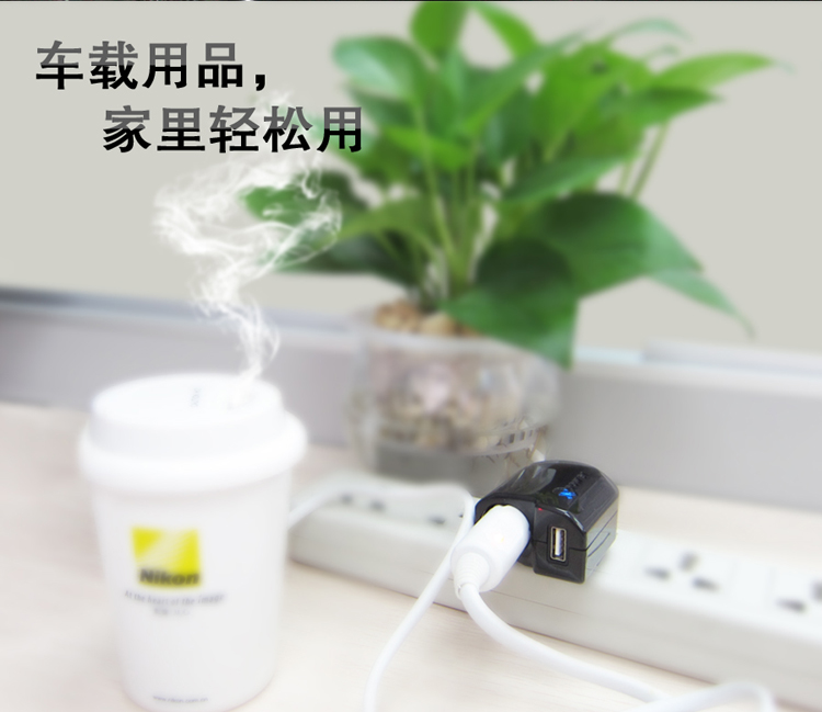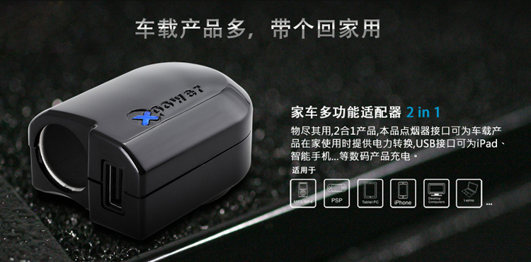 家车多功能适配器2 in 1,物尽其用,2合1产品,本品点烟器接口可为车载产品在家使用时提供电力转换,USB接口可为iPad、智能手机……等数码产品充电。(使用车载电器2合1万能充电)