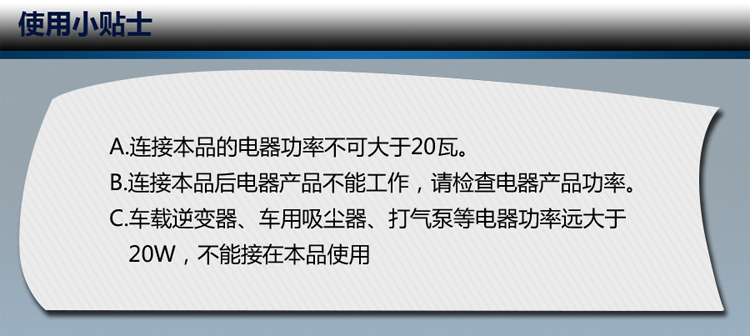 C.车载逆变器、车用吸层器、打气泵等电器功率远大于20W,不能接在本品使用