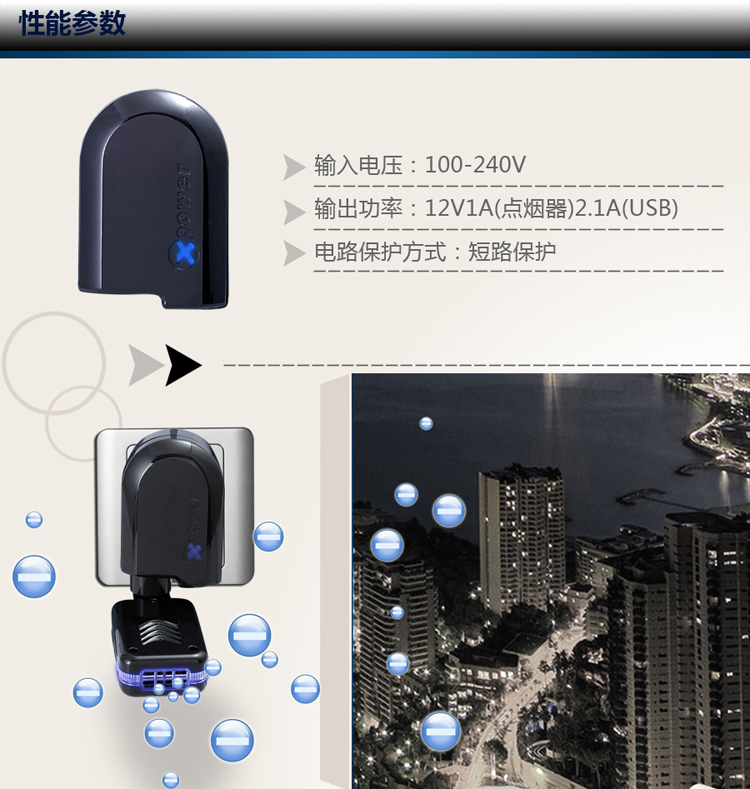 输出功率:12V 1A(点烟器)2.1A(USB)