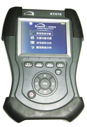 金德KT670柴油诊断系统与针对汽油发动机的KT600智能诊断仪明显为一个平台上的产品,二者不仅外观上非常相似,而且功能配置上也十分相近,金德KT670包含了大多数原厂通讯协议及控制器局域网(CAN)的通讯协议,可扩充性强;配备了超大容量的CF卡,可随意扩充升级程序,实时保存诊断结果;可以实时打印诊断报告;能够实时检测点火系统、传感器以及执行器等电控组件的波形等。