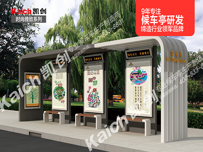 山东候车亭专业生产厂家、城市公交候车亭、仿古候车亭厂家【凯创】 公交候车亭为广大乘客提供遮风避雨的候车条件,又美化了市容市貌。 山东凯创城市设施有限公司位于山东省淄博市,紧邻济青高速公路和309国道,地理位置优越,交通便利。公司注册资金2000万元,厂区占地30余亩,现代化生产车间12000余平,现有专业高级技工140人,其中具有本科以上学历的研发设计团队30人。公司拥有国内先进的产品制造生产设备,主要从事城市公共交通设施和道路交通设施及相关产品的研发、制作、安装、服务业务。 经营的主要产品有:高档公交候车亭、公交站牌、路牌灯箱、太阳能信号灯、交通指示牌、不锈钢城市景观、果皮箱、休闲座椅、宣传栏等。