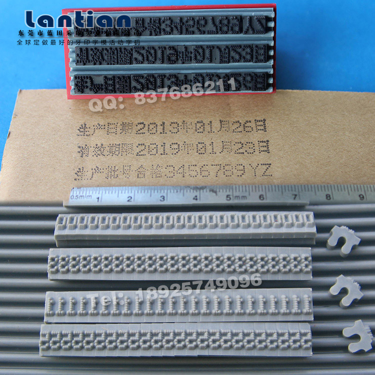 活码印章配套有卡槽板使用,活动字支持拼装1-4排内容盖印,间距和行距都可自由调节。活动字内容由数字0-9、字母A-Z、文字及标点符号,字体有实体和虚体点状格式,活动字规格可按需求定制。