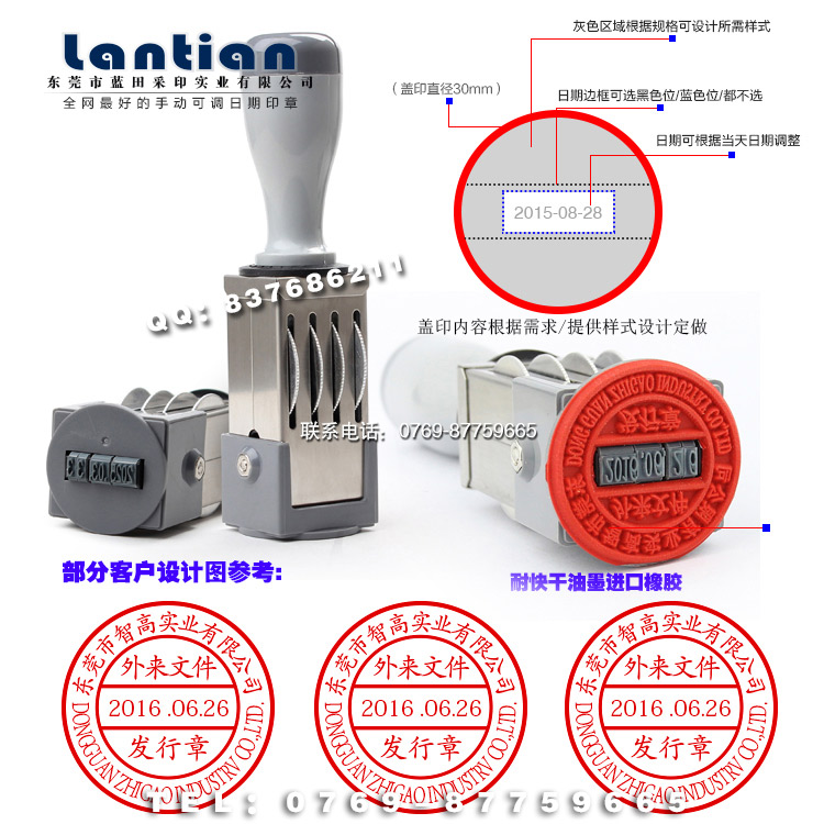 年月日印章形状可定圆形、椭圆形、三角形、方形,内容可定QA、IQA、OQA、FQA、QC、IQC、OQC、FQC、检验员、检验合格、质检部、工程部、发行部、出货部等各种部门,还可定电话号码、公司名称、已抵扣、储蓄账户、英文、地址、编号、姓名、提示语、祝福语、商标及logo图案等。