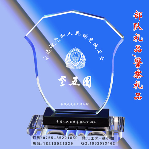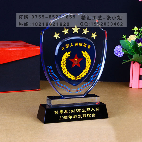 军人这个特殊的职业让我们从五湖四海相汇到军营这片人生的沃土,开始了我们人生新的征程。战友这个祟高的荣誉和亲切的称呼让我们同甘共苦,也培养了战友间深厚的友谊。让我们互融、互助,沐浴着部队大家庭的温暖。感受着那份战友情、同志爱。时间的飞船在人生的轨迹上飞快的划过,留下了灿烂的轨迹。从戎的日子让我们难忘,彼此的脸庞让我们熟悉和难忘。人因相聚而成为朋友,因相聚而等待着离别。 坐在温暖的礼堂内,战友们一张张熟悉的面孔却显得那样的朦胧;那亲如兄弟的战友,熟悉的营房和关心爱护我们成长的领导及培养过我们的连队,这一切都将成为老兵的历史。桃花潭水深千尺,不及战友送我情。精汇工艺—专业为部队定做各种纪念礼品,老兵退役退伍纪念品,部队周年庆典纪念品,部队集训纪念品,部队运动会奖杯奖牌,座谈会纪念品,退役活动纪念品,军校活动礼品,退伍活动礼品,军校庆典活动纪念品,授勋奖章,士官授勋奖牌,老兵退伍活动礼品,功勋牌制作,光荣退役纪念品,部队联谊会礼品,部队表彰奖牌,警校授勋奖牌,十佳军官奖牌,深圳战友聚会纪念礼品定做,深圳水晶纪念品厂家,深圳老兵退伍纪念品定做,北京光荣退伍纪念品厂家,南京陆军退伍纪念品,广州海军退伍纪念品,沈阳空军退伍礼品定做,济南战士退伍纪念品定,兰州水晶纪念品厂家,成都老兵退伍纪念品,深圳州友聚会水晶纪念品定做。西安军人退役礼品纪念品,部队退伍礼品定制