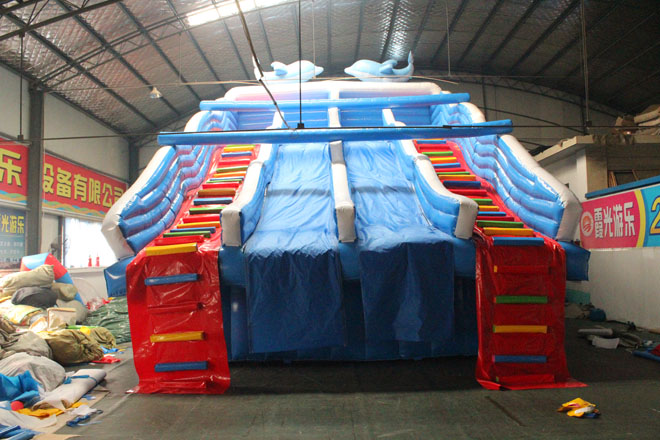 充气滑梯采用的是充气城堡蹦蹦床专用材料:一等夹网PVC环保材料。该环保材料具有抗腐蚀、耐水解、抗氧化、耐撕裂、对皮肤无刺激等等优点。波浪充气滑梯色彩斑斓、造型多样、色彩可选、样式繁多。