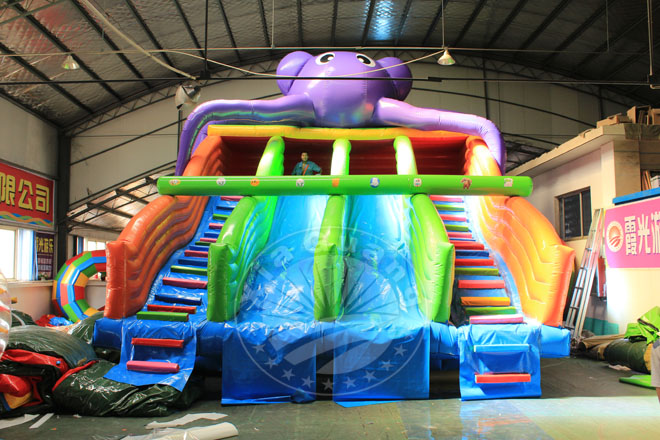 章鱼滑梯与充气水池相互结合,不仅造型独特新颖,而且玩耍过程中乐趣无穷。章鱼滑梯与水池结合处均做过特殊结构和加固处理,具有结合精度高、设计新颖、造型颜色与园区整体和谐统一的特点。
