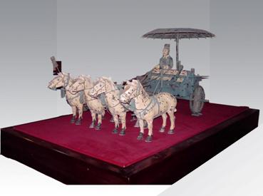 铜车马,其造型生动逼真。驷马头方目圆,双耳短促,脊平臀圆,劲健有力。四蹄贴地,作将欲前行之状。