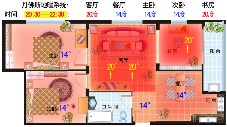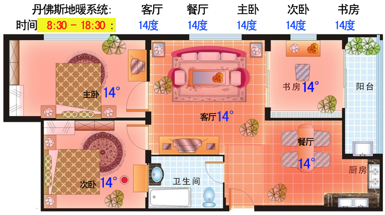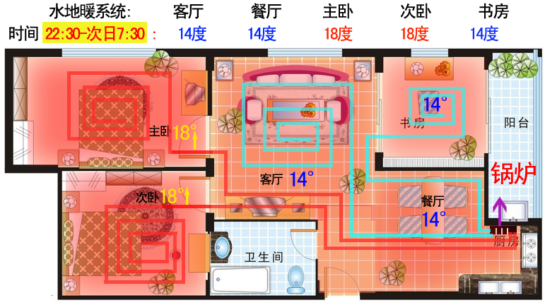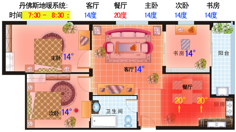 丹麦丹佛斯地暖分区域分时间工作原理图:按照下图中所示,丹佛斯地暖在不同的时间段内工作,使各个区域的温度能灵活的按照业主的需求时间进行工作。从而在满足业主对于温度要求的情况下,用最节能的方式进行加热工作。