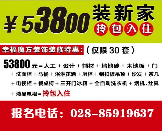 【最新活动】成都电视台推荐装修拎包入住53800=人工+设计+辅材+墙地砖+木地板+厨柜+洁具+门及门锁+全自动洗衣机+液晶电视+开门冰箱+烟机灶具+沙发+茶几+餐桌椅+电视柜=超高性价比,网络预约可享受更多优惠哦!