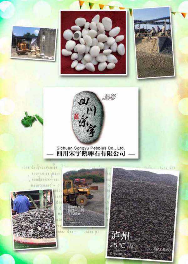 建筑材料,特别适用于公共建筑、别墅、庭院建筑、铺设路面、公园假山、盆景填充材料、园林艺术和其它高级上层... 请联系QQ 27 8273 9999QQ必须手机才能加 电话 189 8273 9999 宋宇 www.lzsongyu.conm <鹅卵石 四川鹅卵石作为一种天然石材,在数亿万年饱经水冲浪打而形成,相互碰撞磨角,又沙一道被深埋在地下亿万年才逐渐形成光滑美丽的鹅 宋宇鹅卵石公司,{加工销售雨花石}{和鹅卵石}(扁黑色鹅卵石)公司原材料库存充足,大规模生产 纯黑颜色的是公司主打产品,光滑。扁平、色泽纯正、现在供应整个南京。