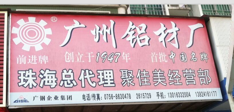 珠海市聚佳美建筑建材经营部,是广州铝材厂有限公司“前进牌”铝材珠海总经销。