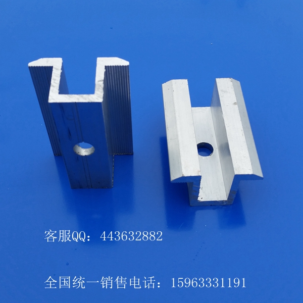 太阳能光伏支架固定夹具导轨 电池板压块 电池板压块系列(单/双侧压块):应用:牢固锁定电池板边压块、中压块 的种类可根据客户的图纸要求定做,以达到适应客户电池板的要求。设计为流线型,增加美观性。本套产品的特点是:成本低廉,组合方便,安装快捷,自由转换角度,应用广泛,定制加工,10年保证,较高寿命,减小风压,排水减砂。