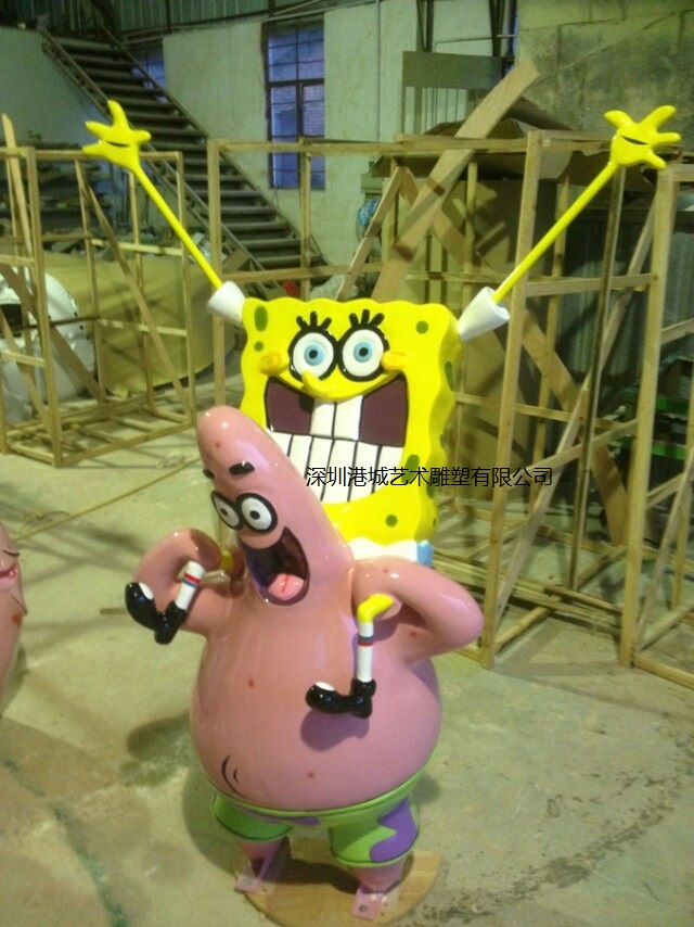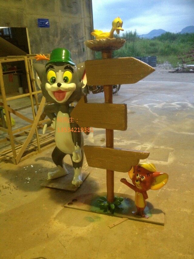 卡通玻璃钢雕塑产品外形精致、表面光洁、色泽柔和、强度高、耐腐蚀、耐酸碱、抗老化、坚固耐用、使用寿命长、不易龟裂、不易褪色、重量轻,表面首先经过专业师傅采用汽车原子灰多次精心打磨,无裂痕,无汽泡砂眼,纹理细腻,色泽均匀;再经过三次底色油漆喷涂,最后喷汽车漆和PU光油。就算摆放户外日晒雨淋也不容易掉色。 ※本店产品材质主要为玻璃钢材质(也可根据客户需求选用砂岩材质),部分产品内有金属支架。