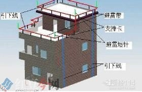 避雷针由接闪器、接地引下线和接地体 3部分组成。接闪器通常采用直径为 15~20mm、长度为1~2m的圆钢或钢管,固定于支柱上端经接地引下线与接地体连接。