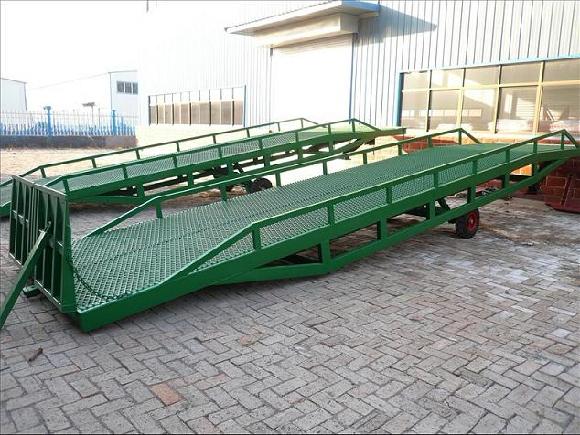 移动式登车桥广泛用于物流场所,是与车配合使用的货物装卸辅助设备,借助该设备,叉车能直接驶入汽车集装厢内部进行批量装卸作业,只需单人操作,不需动力电源,既可实现货移动式登车桥台面铺防滑钢板拉网,下衬δ4钢板,既增加防滑功能,又增加了桥面强度,即使雨雪天气,也不影响装卸货物。