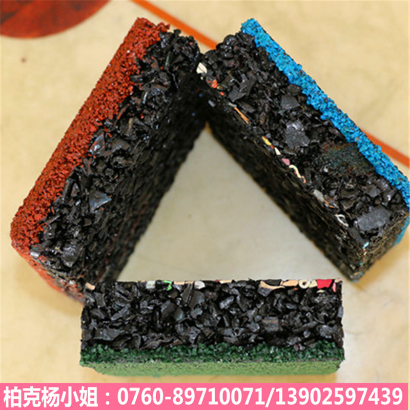 安全橡胶地垫是由橡胶颗粒经处理着色后采用胶粘剂包覆混合,再压制而成。主要用于室外,也可用于室内。橡胶地砖由两层不同密度的材料构成,彩色面层采用细胶粉或细胶丝并经过特殊工艺着色,底层则采用粗胶粉或胶粒、胶丝制成。