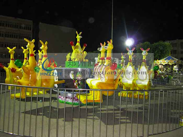 袋鼠跳弹跳着童年的梦想,袋鼠跳采用的是真实袋鼠模型,共分为八臂,每臂上两个座位,共可乘坐16人,占地面积80平米,弹跳高度1.85米,模型的栩栩如生是这款游乐设备的一个经典之作。袋鼠跳是一款新型游乐设备,在原本的袋鼠模型上进行萌化处理,使之非常可爱,袋鼠在澳洲享有美誉,袋鼠跳同样在游乐设备中享有盛誉,弹跳的不仅是袋鼠跳,更有孩子们的梦想。